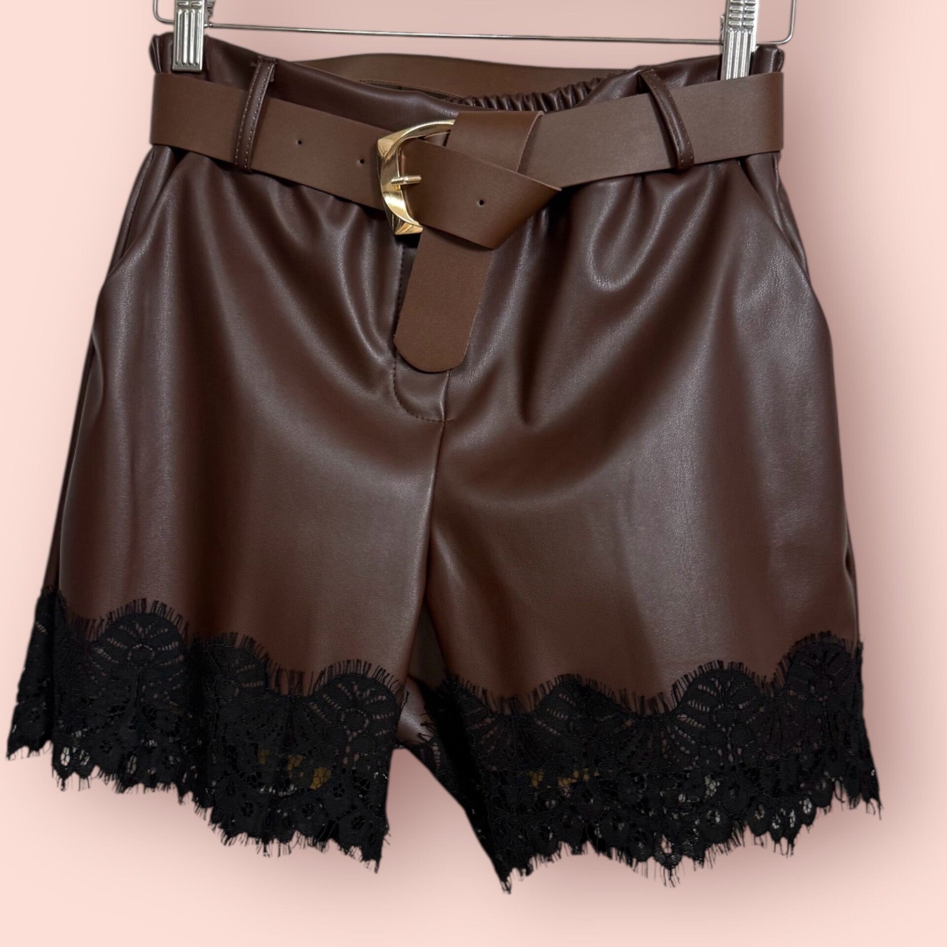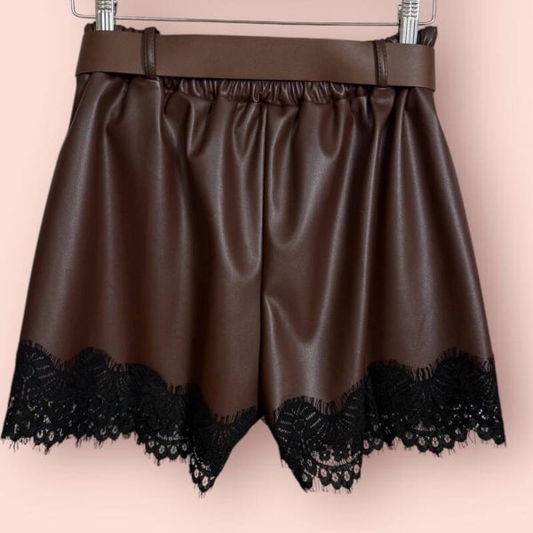 Edle Kunstleder-Shorts in Schokobraun mit schwarzer Spitzendetailkante und passendem Gürtel. Weich, bequem und perfekt für feminine, trendige Outfits.Einheitsgröße – tragbar bis ca. Größe 42/44.