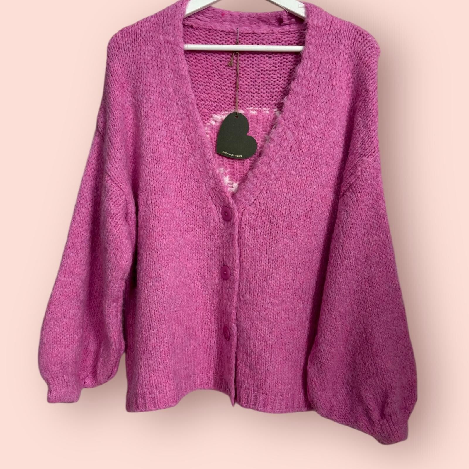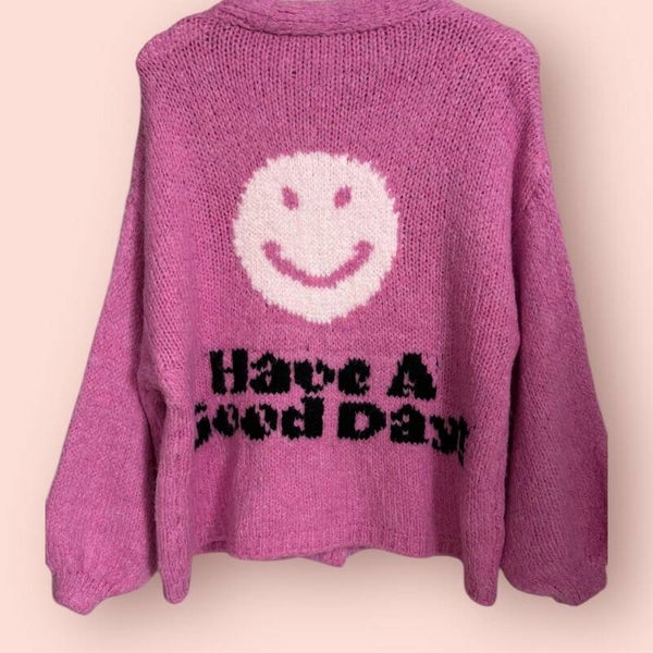 Kuscheliger, pinker Strick-Cardigan im Oversize-Look mit V-Ausschnitt und Knopfleiste. Der Rückseite ziert ein großer weißer Smiley mit dem Schriftzug „Have A Good Day“ – ein fröhlicher Hingucker für jeden Tag. Weich, bequem und perfekt zum Kombinieren.
